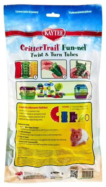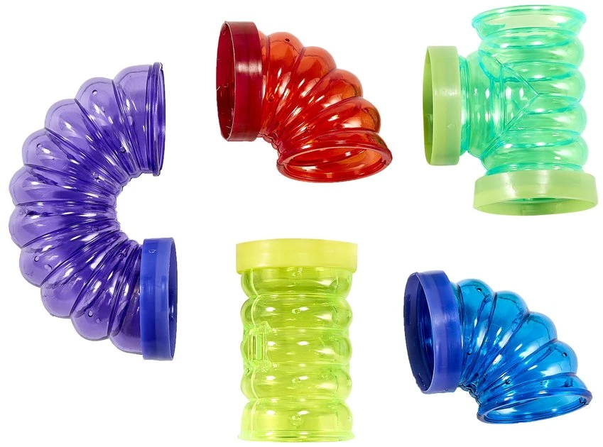 Provide your little guy with more room to roam in his Critter Trail Habitat with Kaytee CritterTrail Fun-nel Twist & Turn Tubes! This pack comes with five bubble-wave tube designs with comfort grips that are safe for your pet’s paws. It also comes with connector rings to help you safely build secure passageways for your sidekick. The five tubes come in a variety of colors, shapes and sizes, allowing you to get creative while building a fun playground for your furry family member!