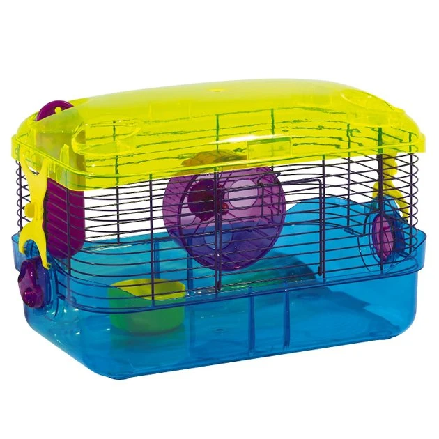 - Includes a top mount water bottle, exercise wheel and food dish.
