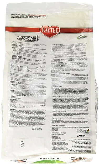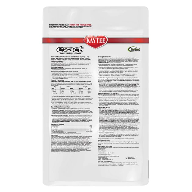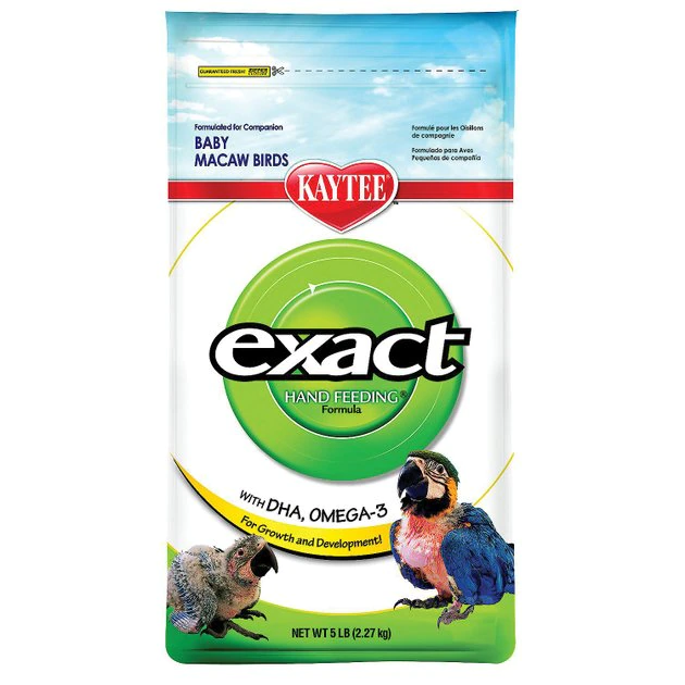 Help your baby Macaw grow faster, wean earlier and develop brighter plumage with Kaytee Exact Hand Feeding Formula Baby Macaw Bird Food. Baby birds need a high-nutrient, high-fat diet to grow and develop healthy bones, muscle and beaks. Kaytee Exact Hand Feeding Formula Baby Macaw Bird Food is designed to nurture baby birds through the most critical stages when body weight should double and triple in weeks. Its high-nutrient levels reduce the need for overnight feedings and will not cause crop slowdown. It contains probiotics, prebiotics and digestive enzymes to ensure healthy digestion. Mix in small quantities and discard any uneaten portions.