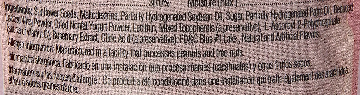 Sunflower Seeds, Maltodextrin, Partially Hydrogenated Soybean Oil, Sugar, Partially Hydrogenated Palm Oil, Reduced Lactose Whey Powder, Dried Nonfat Yogurt Powder, Lecithin, Mixed Tocopherols (a Preservative), L-Ascorbyl-2-Polyphosphate (Source of Vitamin C), Rosemary Extract, Citric Acid, Natural and Artificial Flavors, Artificial Colors.
