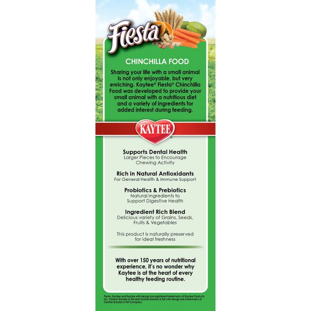 Feed your Chinchilla a delicious, fiesta-inspired blend of fruits, vegetables, seed and grains with Kaytee Fiesta Gourmet Variety Diet Chinchilla Food. Chinchillas love variety in their diet and enjoy foraging for food with different shapes, colors and textures. They also need hay for proper digestion. Kaytee Fiesta Gourmet Variety Diet Chinchilla Food offers more variety than before with a blend of ingredients including sun-cured alfalfa meal, corn, sunflower, carrots, peanuts, banana and more. And it contains DHA and Omega-3 for brain, heart and eye health and prebiotics and probiotics to support digestion.