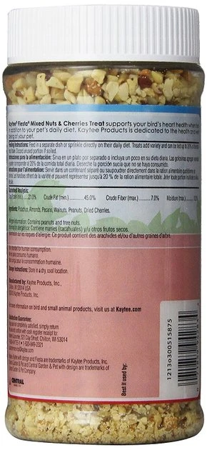 Feed your bird a tasty and nutritious treat with Kaytee Fiesta Mixed Nuts & Cherries Bird Treats. Treats are a great way to bond with your bird and add variety to their diet. Kaytee Fiesta Mixed Nuts & Cherries Bird Treats are a blend of nuts like pistachios, almonds and pecans and dried cherries your bird will love. Offer as an occasional treat or training reward. Discard any uneaten or soiled portions.