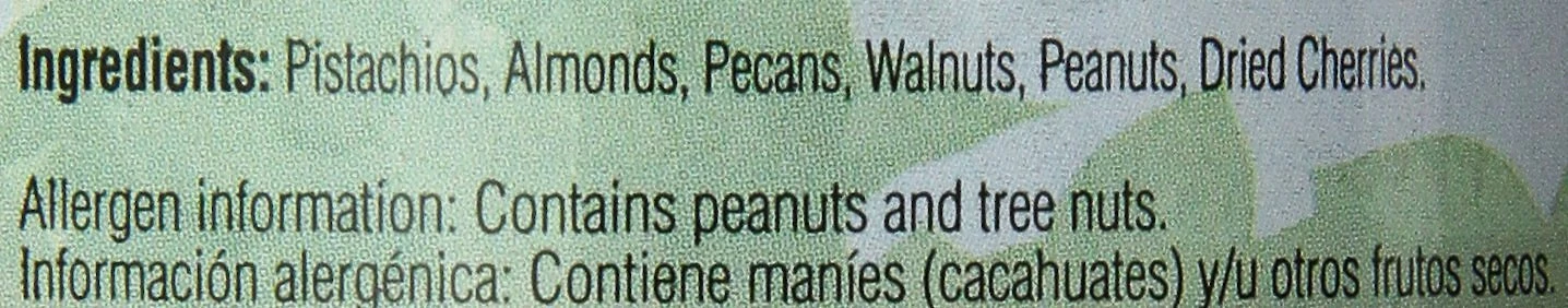 Pistachios, Almonds, Pecans, Peanuts, Dried Cherries.