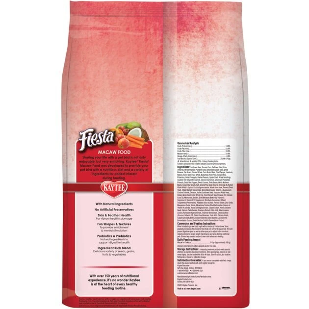 Food for your feathered friend developed by an avian nutritionist? Yes, please. That’s what you get with Kaytee Fiesta Natural Macaw, 4.5 Pounds, Fortified Gourmet Diet. This bird food is a nutritionally fortified gourmet diet made of a premium blend of fruits, vegetables, seeds, and grains, which offers the maximum in both nutrition and fun. It also contains prebiotics and probiotics and is formulated with your bird species in mind.