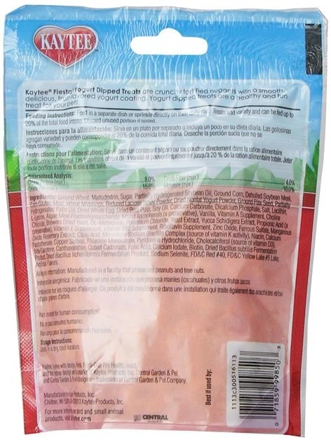 Give your bird a tropical, crunchy, creamy treat that is fun and nutritious with Kaytee Fiesta Strawberry Banana Flavored Yogurt Dipped Small Hookbill Bird Treats. Birds love variety and will often sort and play with food with different colors, shapes and textures. Kaytee Fiesta Strawberry Banana Flavored Yogurt Dipped Small Hookbill Bird Treats are a delicious blend of tropical fruits and crunchy, fortified nuggets dipped in a creamy, fruit-flavored yogurt coating. Feed as an occasional treat or as a training reward.