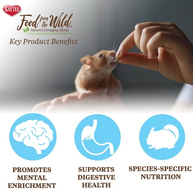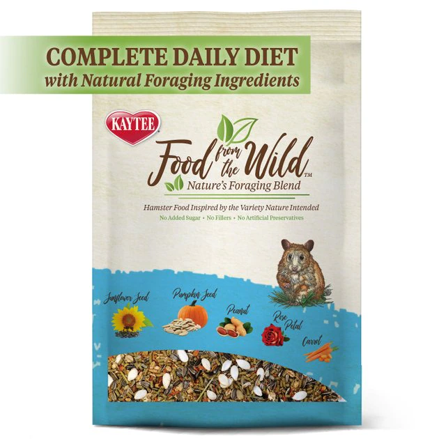 Give your furry friend a meal that matches her natural diet with Kaytee Food From the Wild Hamster Food. It features hand-selected sunflower seeds, peanuts, pumpkin seeds, carrots and roses for a blend inspired by the ancestral feeding habits of hamsters. This pelleted food encourages healthy foraging activity while providing your paw-tner with comprehensive nutrition and natural probiotics to support digestive health. It also contains no added sugar, fillers or artificial preservatives because your companion deserves nothing but the best. Let your hamster enjoy a medley of real fruits, vegetables and flowers with this food from Kaytee.