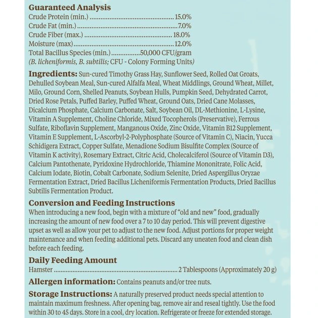 Sun-cured Timothy Grass Hay, Sunflower Seed, Rolled Oat Groats, Dehulled Soybean Meal, Sun-cured Alfalfa Meal, Wheat Middlings, Ground Wheat, Millet, Milo, Ground Corn, Shelled Peanuts, Soybean Hulls, Pumpkin Seed, Dehydrated Carrot, Dried Rose Petals, Puffed Barley, Puffed Wheat, Ground Oats, Fried Cane Molasses, Dicalcium Phosphate, Calcium Carbonate, Salt, Soybean Oil, DL-Methionine, L-Lysine, Vitamin A Supplement, Cholin Chloride, Mixed Tocopherols (preservative), Ferrous Sulfate, Riboflavin Supplement, Manganous Oxide, Zinc Oxide, Vitamin B12 Supplement, Vitamin E Supplement, L-Ascorbyl-2-Polyshosphate (Source of Vitamin C), Niacin, Yucca Schidigera Extract, Copper Sulfate, Menadione Sodium Bisulfate Complex (Source of Vitamin K activity), Rosemary Extract, Citric Acid, Cholecalciferol (Source of Vitamin D3), Calcium Pantothenate, Pryridoxine Hydrochloride, Thiamine Mononitrate, Folic Acid, Calcium Iodate, Biotin, Cobalt Carbonate, Sodium Selenite, Dried ASpergillus Oryzae Fermentation Extract, Dried Bacillus Licheniformis Fermentation Product, Dried Bacillus Subtillis Fermentation Product.