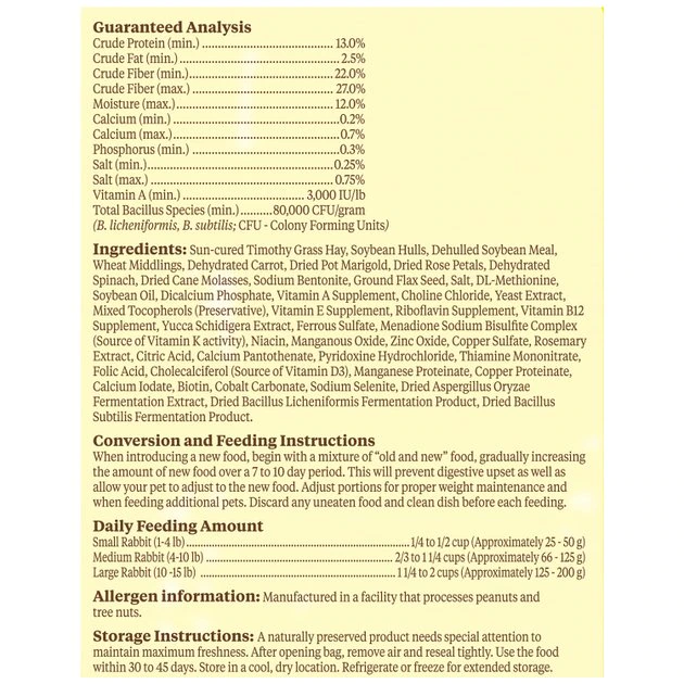 Sun-cured Timothy Grass Hay, Soybean Hulls, Dehulled Soybean Meal, Wheat Middlings, Dehydrated Carrot, Dried Pot Marigold, Dried Rose Petals, Dehydrated Spinach, Dried Cane Molasses, Sodium Bentonite, Ground Flax Seed, Salt, DL-Methionine, Soybean Oil, Dicalcium Phosphate, Vitamin A Supplement, Choline Chloride, Yeast Extract, Mixed Tocopherols (Preservative), Vitamin E Supplement, Riboflavin Supplement, Vitamin B12 Supplement, Yucca Schidigera Extract, Ferrous Sulfate, Menadione Sodium Bisulfate Complex (Source of Vitamin K activity), Niacin, Manganous Oxide, Zinc Oxide, Copper Sulfate, Rosemary Extract, Citric Acid, Calcium Pantothenate, Pyridoxine Hydrochloride, Thiamine Mononitrate, Folic Acid, Cholecalciferol (Source of Vitamin D3), Maganese Proteinate, Copper Proteinate, Calcium Iodate, Biotin, Cobalt Carbonate, Sodium Selenite, Dried Aspergillus Oryzae Fermentation Extract, Dried Bacillus Licheniformis Fermentation Product, Dried Bacillus Subtillis Fermentation Product.