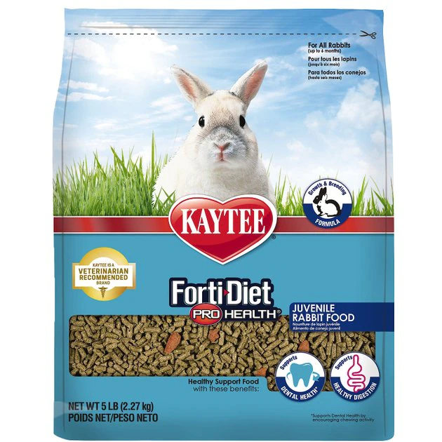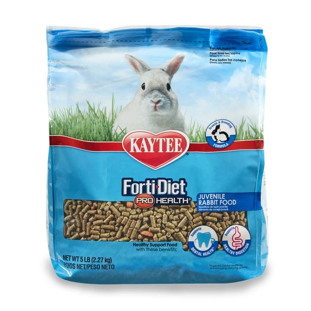 Feed your juvenile rabbit the wholesome ingredients he for healthy growth and development with Kaytee Forti-Diet Pro Health Juvenile Rabbit Food. Young small pets need a diet rich in protein for healthy skin and coat, muscle development and strong immunity. Rabbits also need hay for healthy digestion. Kaytee Forti-Diet Pro Health Juvenile Rabbit Food provides the essential nutrients your pet needs to enhance health and appearance. It contains sun-cured alfalfa meal to aid in the digestion process, protein from grains like oats and wheat and yucca for odor control. Kaytee Forti-Diet Pro Health Juvenile Rabbit Food is fortified with DHA and Omega-3 for brain, heart and eye health and prebiotics and probiotics to support digestion.