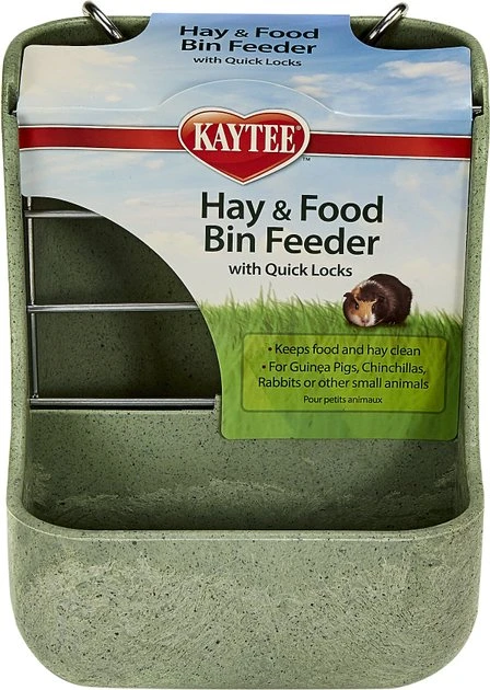 The Kaytee Hay-N-Food Bin with Quick Locks Small Animal Feeder is a convenient feeder that provides a clean food supply for guinea pigs, chinchillas, rabbits and other small animals. This combo feeder has one compartment for hay and a separate compartment for food. It helps keep your pet’s food fresh and clean by keeping it off the floor of the cage. The Hay-N-Food Bin comes with carabiner clips that allow you to hang the feeder securely anywhere in your pet’s cage.