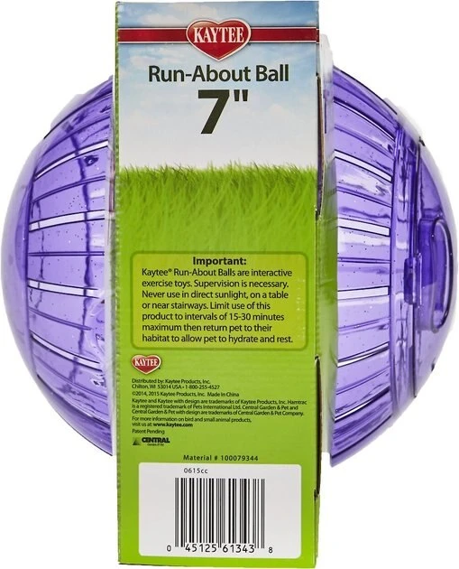 Watch your furry friend explore, roam and race from room to room with the Kaytee-Run About 7” Small Animal Exercise Ball. The exercise ball provides a great way for you and your pint-sized sidekick to have interactive fun together! Your hamster or gerbil is secured in the ball to allow him to safely relieve excess energy as he curiously travels across the floor. Use the ball as a temporary holding space for when you need to clean your best bud’s home.