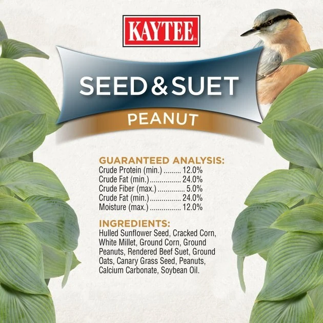 Hulled sunflower seed, cracked corn, white millet, ground corn, ground peanuts, rendered beef suet, ground oats, canary grass seed, peanuts, calcium carbonate, soybean oil.