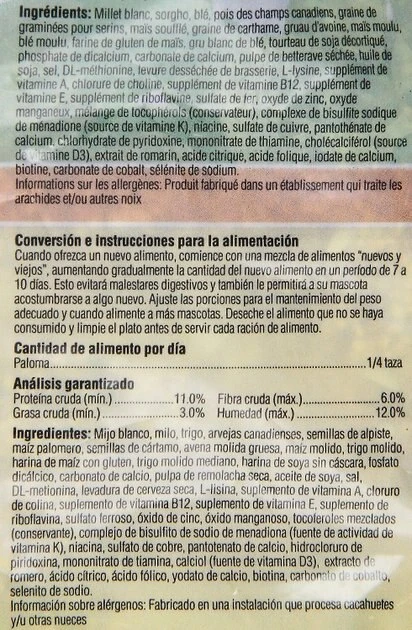 White Millet, Milo, Wheat, Canadian Field Peas, Red Millet, Canary Grass Seed, Popcorn, Safflower, Oat Groats, Ground Yellow Corn, Ground Wheat, Corn Gluten Meal, Wheat Middling, Dehulled Soybean Meal, Dicalcium Phosphate, Calcium Carbonate, Beet Pulp, Soy Oil, Salt, Fish Meal, Dl-Methionine, Brewer’s Dried Yeast, L-Lysine, Choline Chloride, Vitamin B12 Supplement, Vitamin E Supplement, Ferrous Carbonate, Zinc Oxide, Riboflavin Supplement, Manganous Oxide, Menadione Sodium Bisulfite Complex (Source of Vitamin K Activity), Ethoxyquin (a Preservative), Niacin, Calcium Pantothenate, Copper Oxide, Vitamin A Supplement, Cholecalciferol (Source of Vitamin D3), Pyridoxine Hydrochloride, Thiamine Mononitrate, Calcium Iodate, Cobalt Carbonate, Folic Acid, Biotin, and Sodium Selenite.